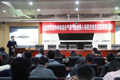 11月24日,中央电视台著名气象节目主持人宋英杰先生应我院邀请,在图书馆学术报告厅为师生作了题为《中国古代气象学》、《气象信息传播的几个特征》的学术讲座。讲座分上下午两场,分别由我院院长许建康、副院长阮礼荣主持,副院长曹爱华、院党委副书记詹筱茹出席,100余名师生现场聆听。