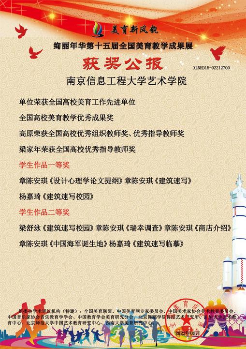 近日,由中全国美育联盟、中国美育网专家委员会、中国美术家协会美术教育委员会等举办“美育新风貌·绚丽年华第十五届全国学校美育教学成果展”作品名单公布,我院荣获全国高校美育工作先进单位、全国高校美育教学优秀成果奖,院长梁家年教授荣获全国高校优秀指导教师奖,设计艺术系教师高原副教授荣获高校优秀组织教师奖、优秀指导教师奖。学生荣获一等奖、二等奖四项。具体名单如下: