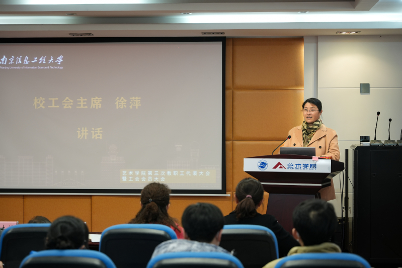 徐萍对艺术学院工会工作给予指导,她充分肯定了艺术学院各项事业发展的成果,并对大会的隆重召开表示热烈的祝贺。徐主席还就近年来我校工会组织建设基本情况、教职工权益维护、文体活动、女职工工作等特色和亮点等方面做了介绍。她指出,教职工大会制度是学院内部治理体系的重要组成部分,是学院坚持依法行政,贯彻全心全意依靠教职工办学指导思想的重要组织形式,也是广大教职工行使当家作主权利,参与学院民主决策、民主管理和民主监督的重要途径,对推进学院民主建设、提高工作效率具有重要意义。