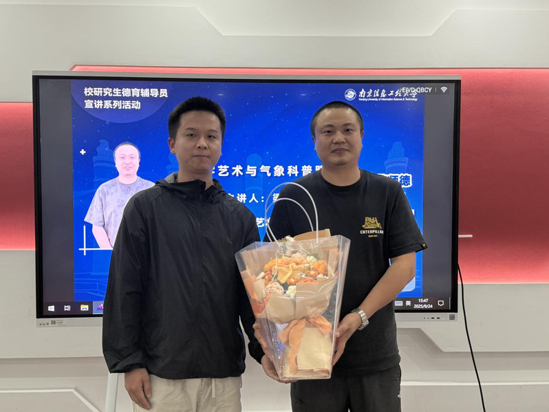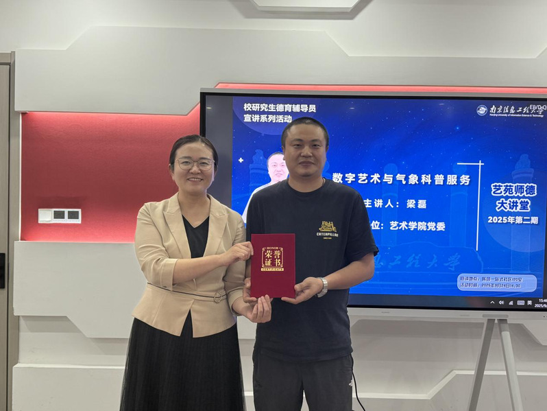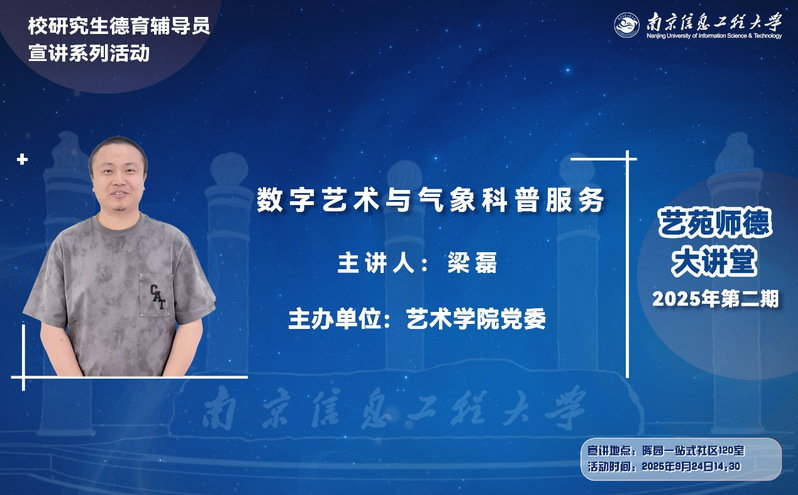 本次宣讲聚焦“数字艺术与气象科普服务”,邀请艺术学院院长助理、动画系主任、副教授、硕士生导师梁磊老师担任主讲,院党委书记詹筱茹及2025级全体研究生到场聆听。活动由研究生辅导员曾博宇老师主持。