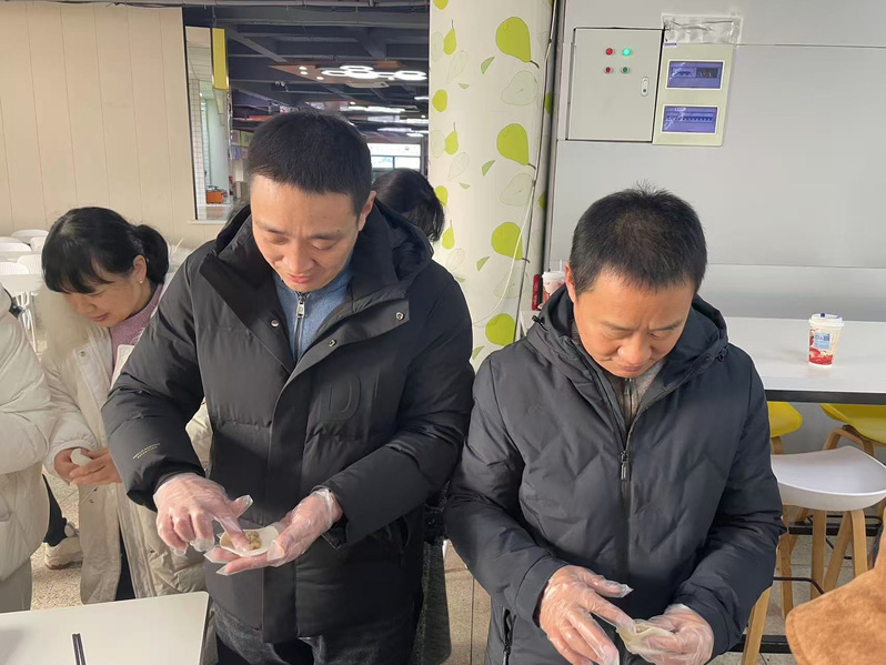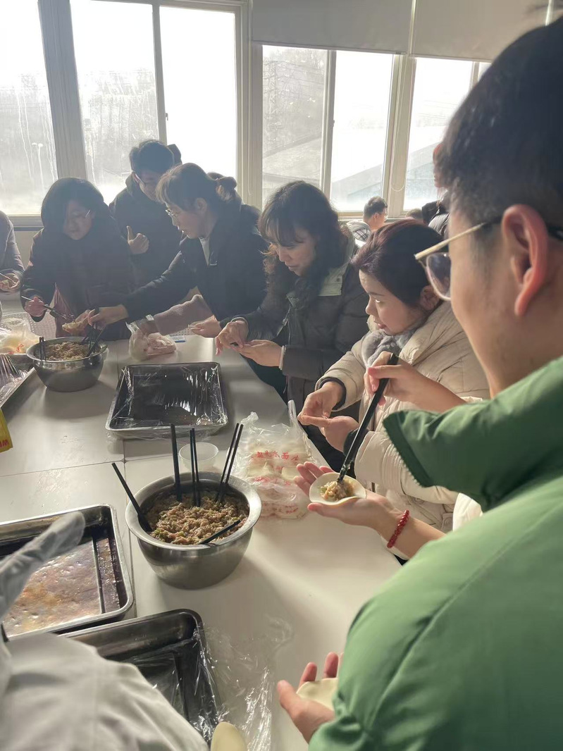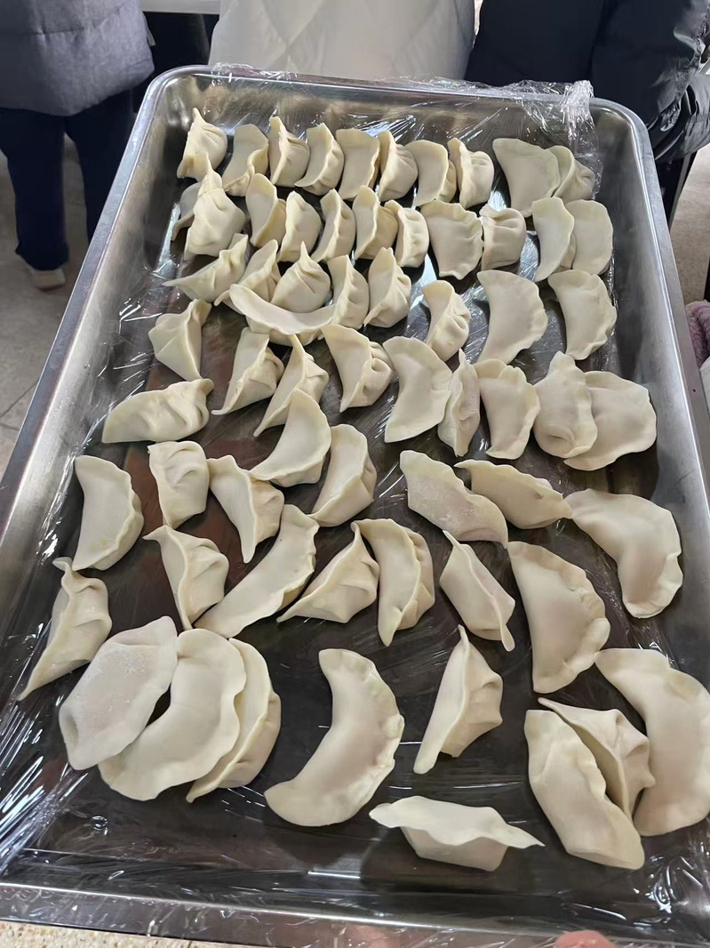 活动一始,“趣味包饺子” 环节便点燃了现场热情。食堂工作人员提前备好新鲜的面团、馅料与工具,教职工们自发分组,洗手挽袖迅速投入其中。大家分工协作,有的捏褶塑形创意十足,元宝形、月牙形、柳叶形的饺子在指尖翻飞,形态各异却同样饱含心意。不熟悉操作的教职工主动请教,经验丰富的同事耐心指导,欢声笑语中,一盘盘饱满的饺子整齐排列,不仅包裹着鲜香的馅料,更裹着教职工间的互助情谊与对新年的美好期盼。