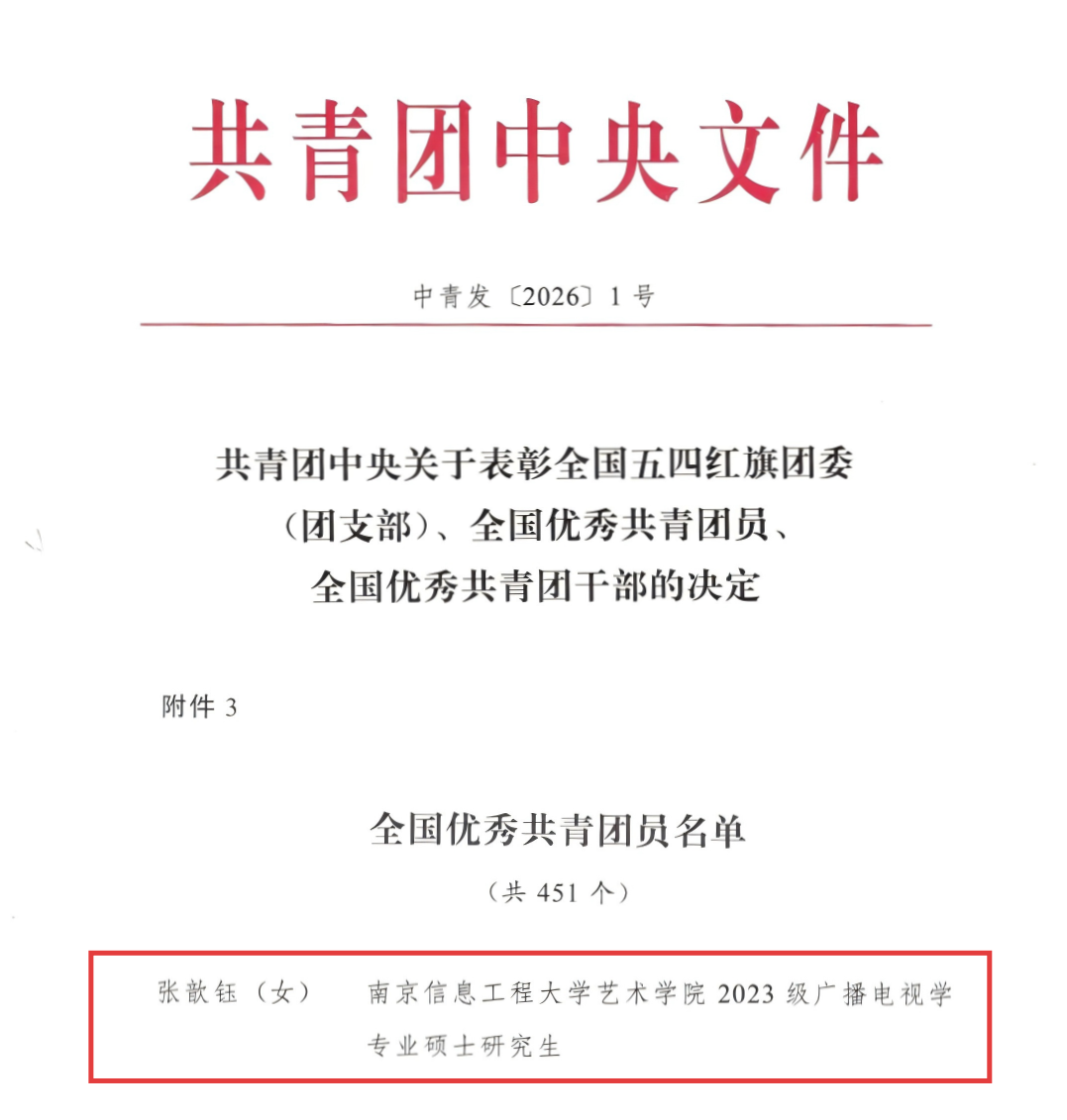 近日,共青团中央发布《关于表彰全国五四红旗团委(团支部)、全国优秀共青团员、全国优秀共青团干部的决定》(中青发〔2026〕1号),我院2023级广播电视学专业硕士研究生张歆钰获评“全国优秀共青团员”荣誉称号。